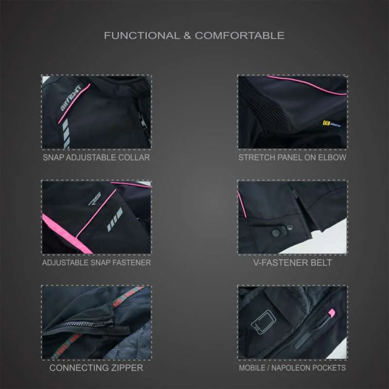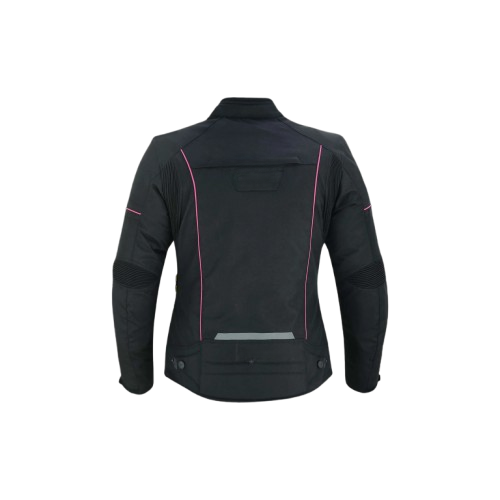 Ladies motorcycle jackets have CE armors protector on elbows, shoulders & back to ensure safety during your unscheduled meeting with asphalt. Motorcycle safety jacket have soft rubber padding on the back that gives extra comfort to the spine.